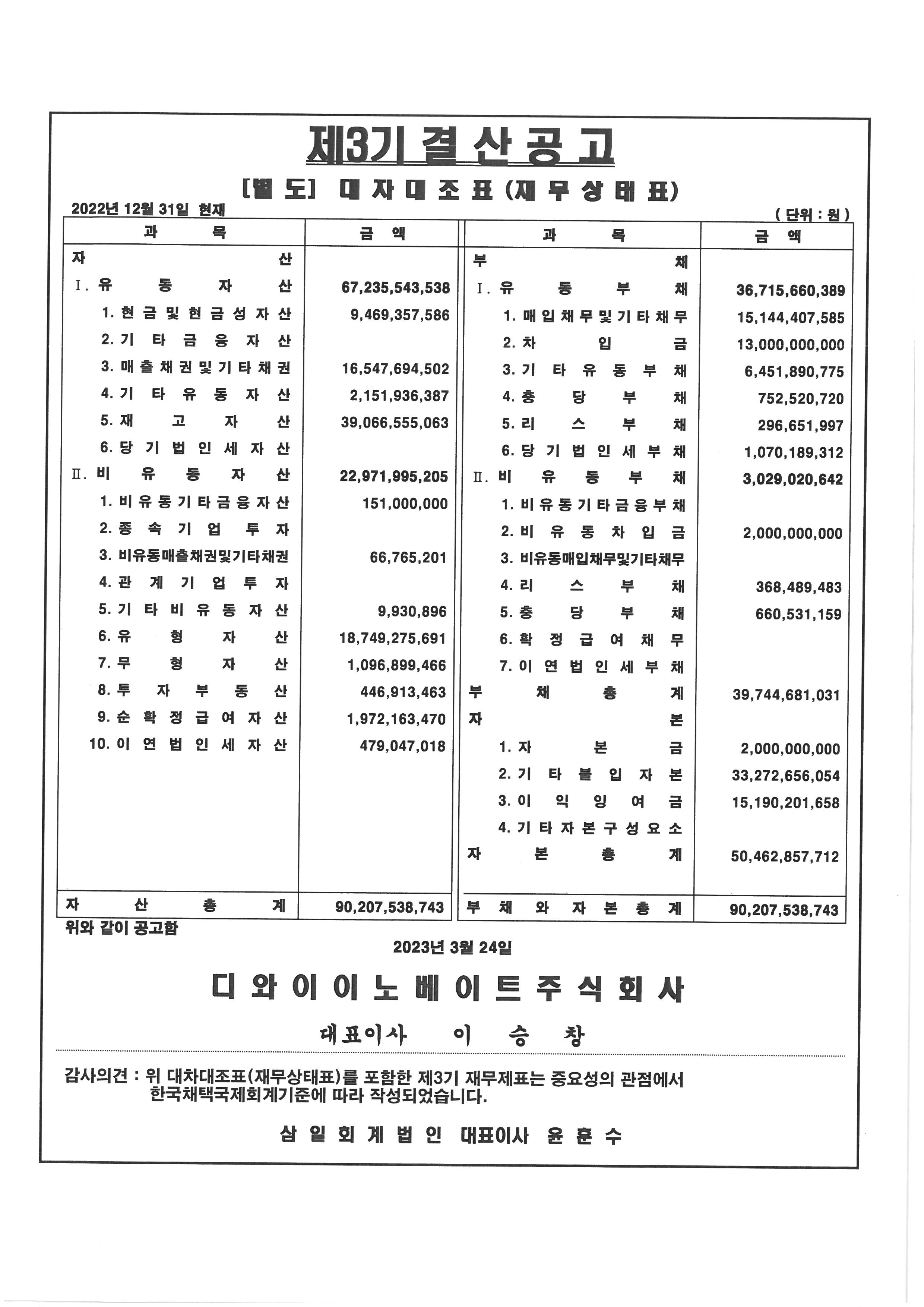 제3기 대차대조표 공고